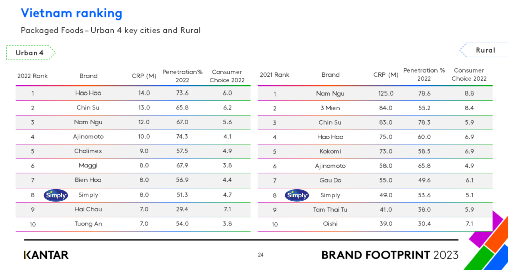 Ngoài ra, nhãn hiệu dầu ăn Simply cũng lọt Top 10 thương hiệu thực phẩm đóng gói được chọn mua nhiều nhất tại thành thị và nông thôn. Điều này chứng tỏ chất lượng sản phẩm Simply chính là yếu tố duy trì lòng tin, từ đó tăng tần suất sử dụng và sức mua của người tiêu dùng.